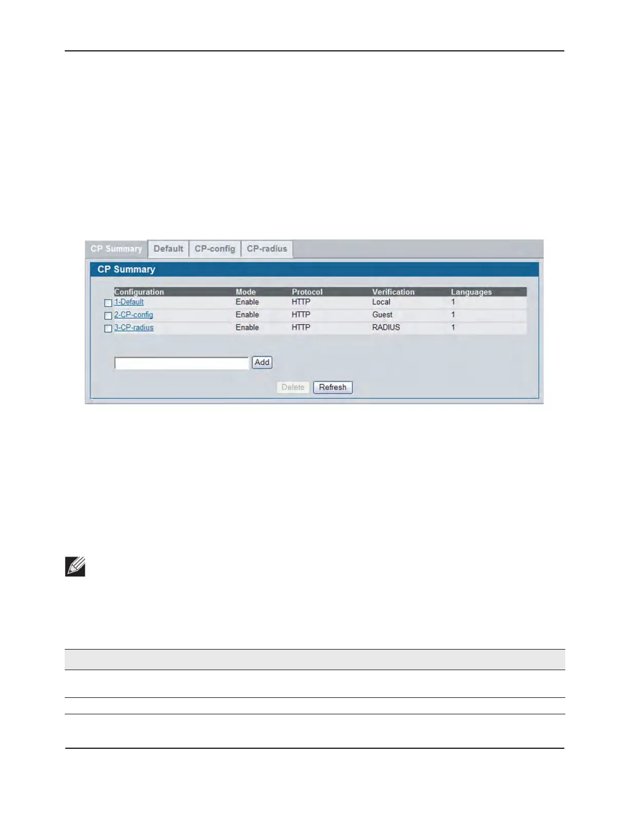 Use the CP Summary page to create or delete captive portal configurations. The switch supports 10 CP