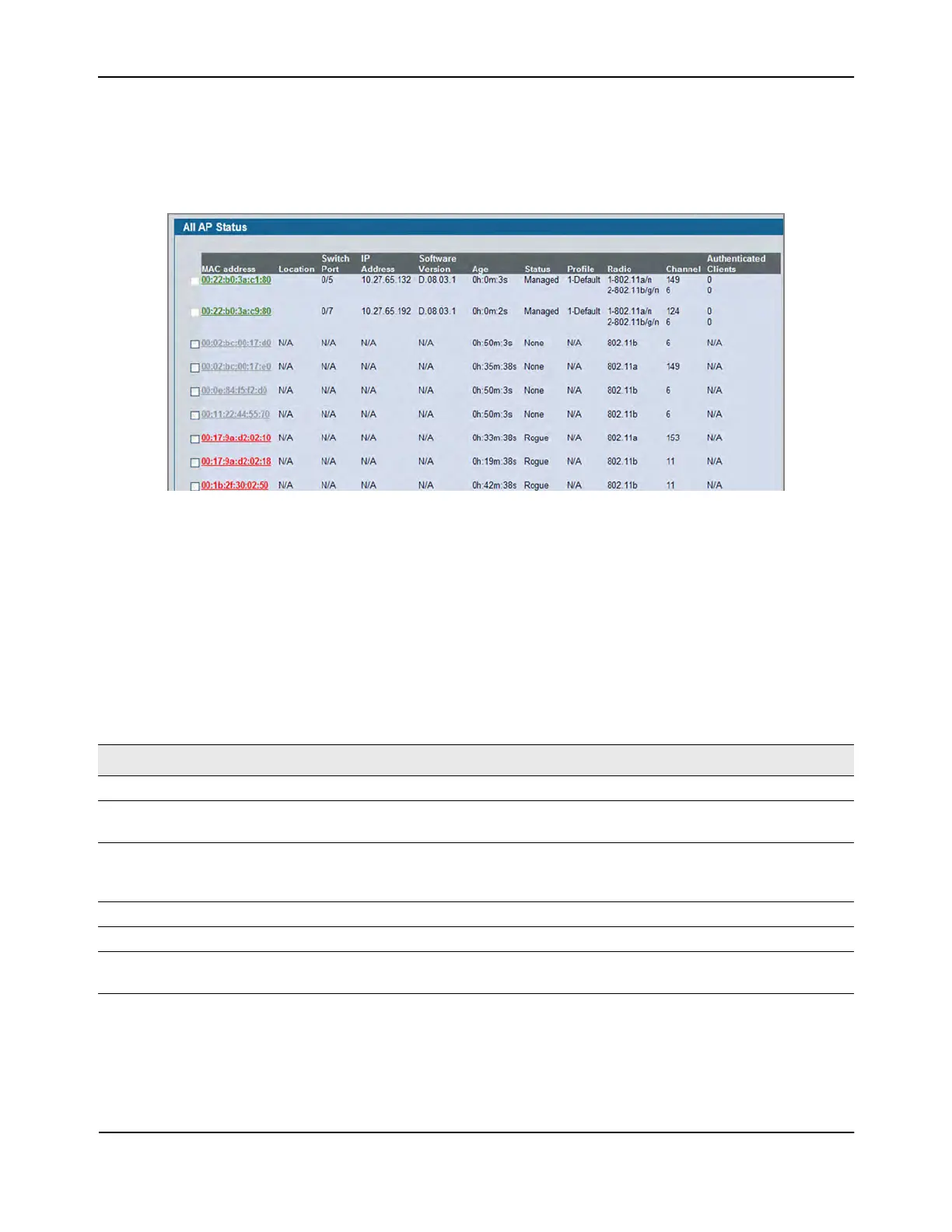 The All AP Status page shows summary information about managed, failed, and rogue access points the switch