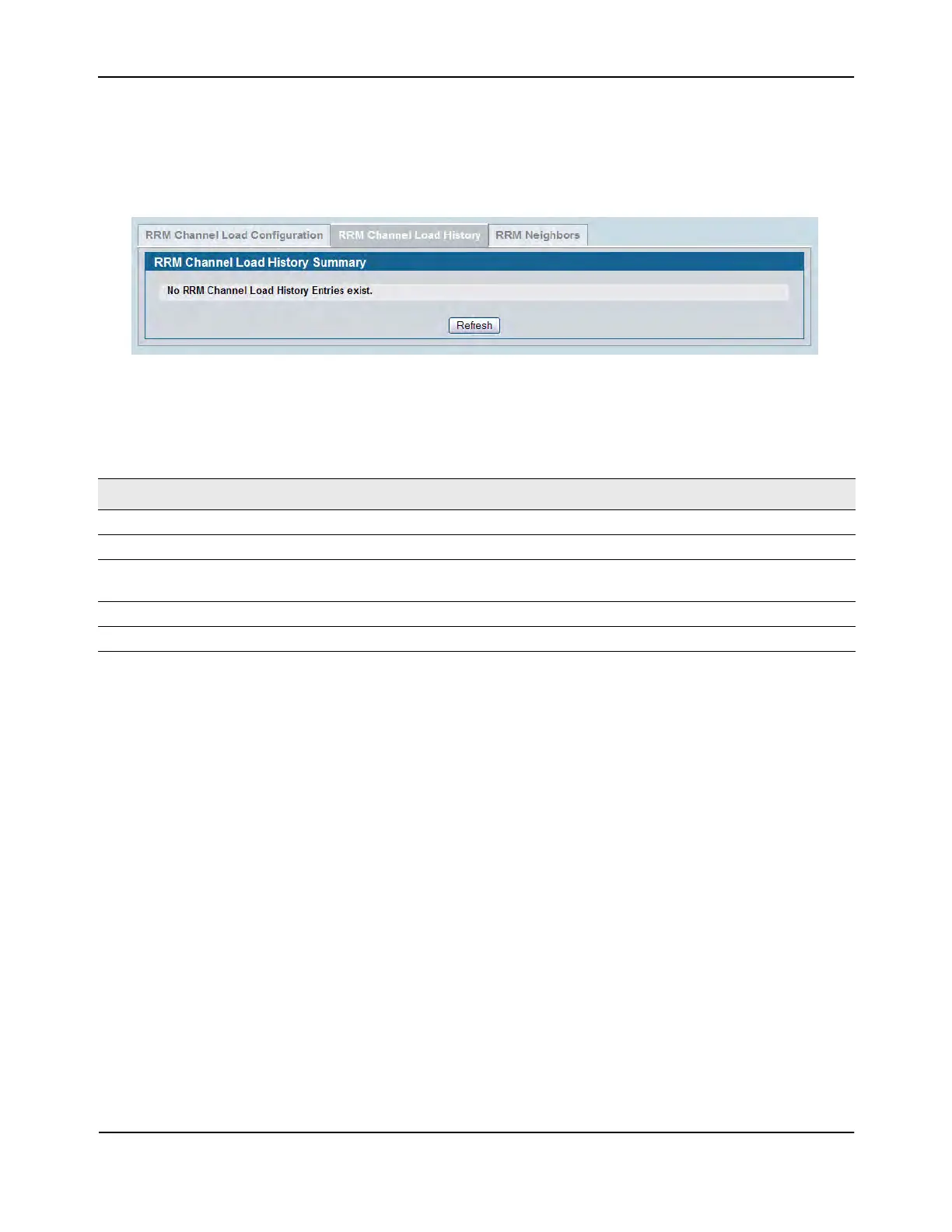 The RRM Channel Load History page shows the last 100 channel load history entries. If a new entry is added