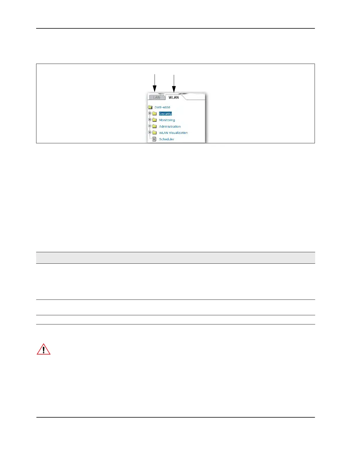 The D-Link DWS-4000 Series switch navigation tree also contains a LAN tab for wired features and a WLAN tab