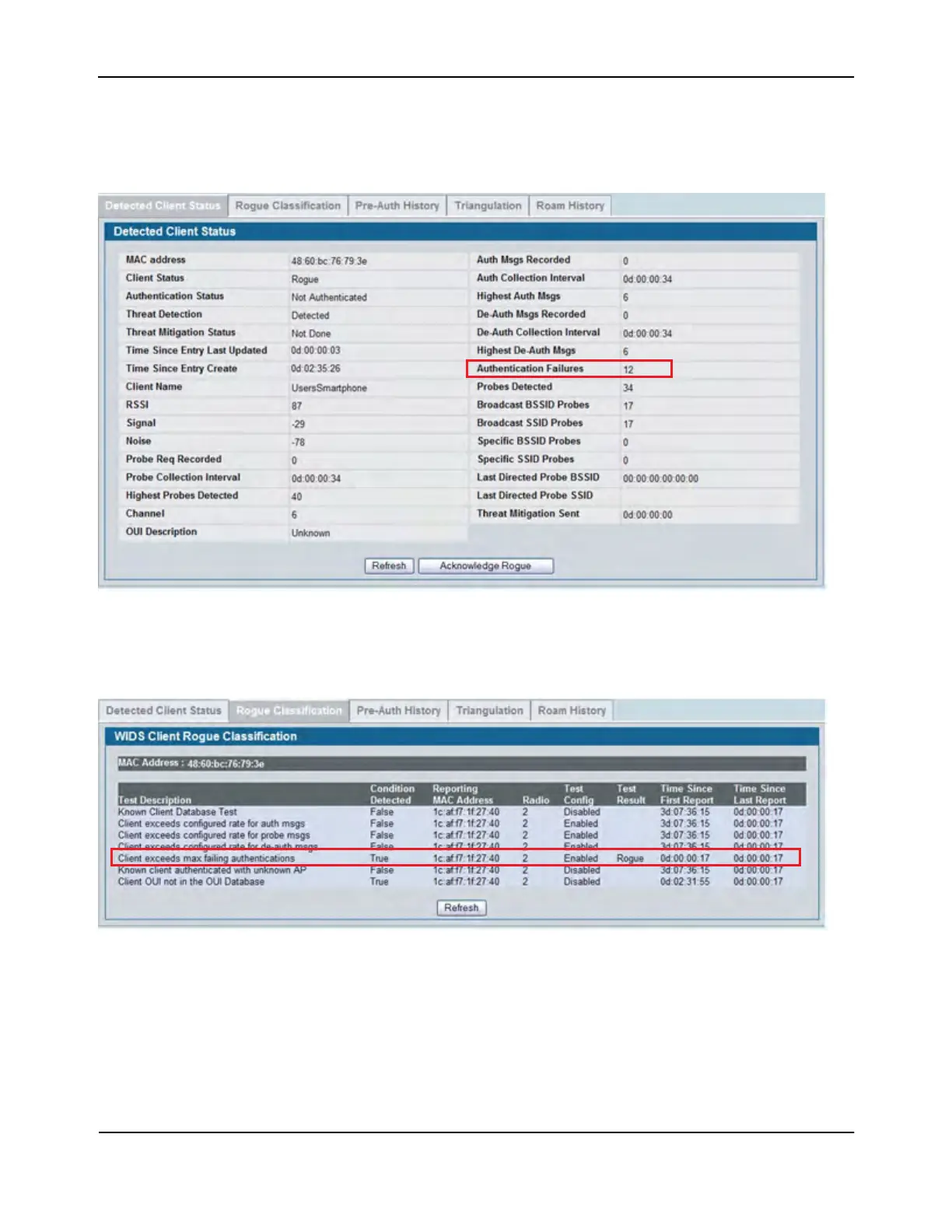 Figure 451 shows a client that is identified as a rogue because the Authentication Failure Threshold Value