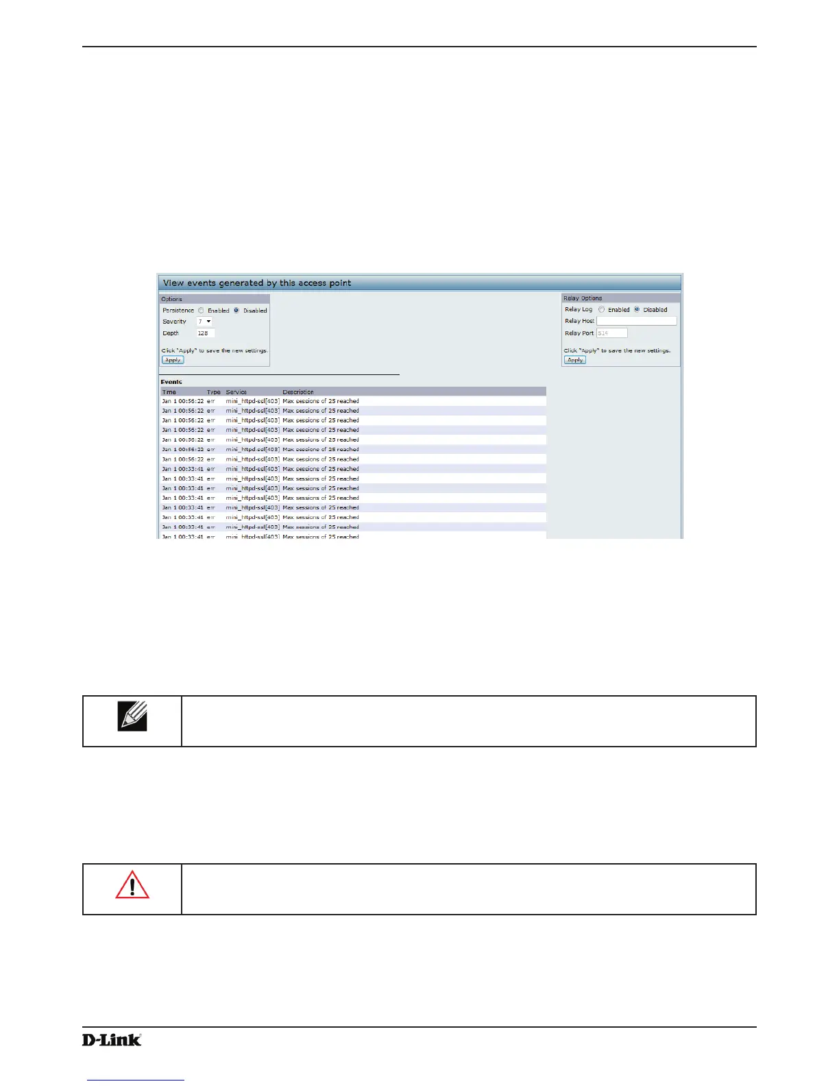 To conîšżgure persistent logging on the Events page, set the persistence, severity, and depth options as described in