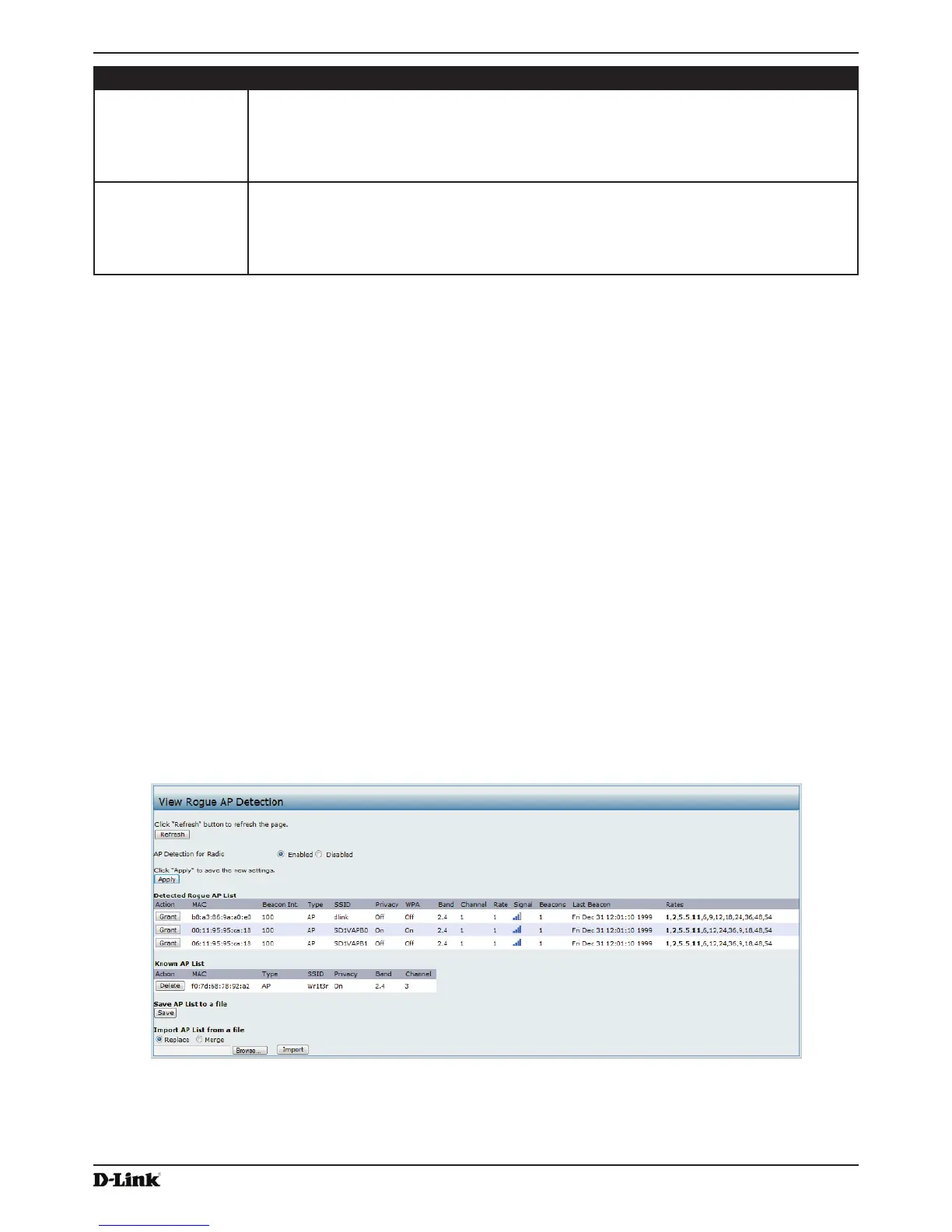 •) Detected Rogue AP List — Lists all APs within range of the AP that have not been acknowledged as known APs.