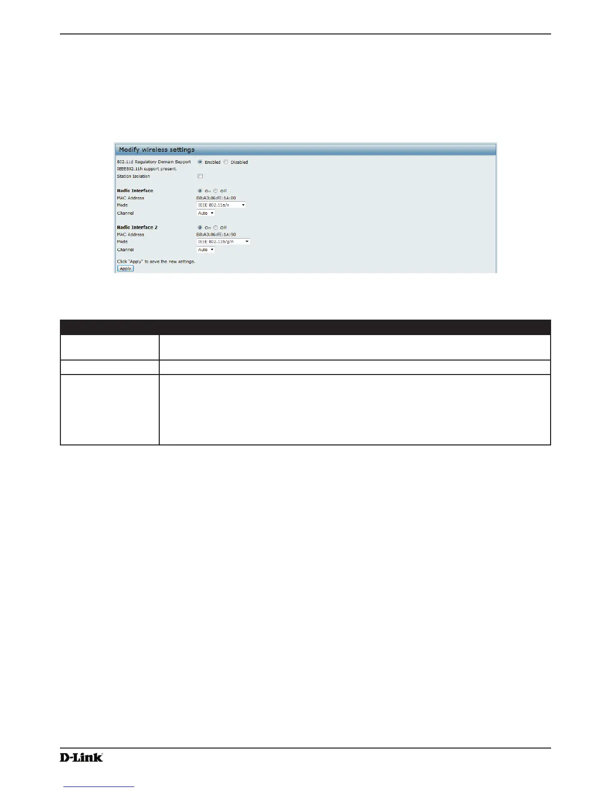 The following table describes the îšżelds and conîšżguration options available on the Wireless Settings page.