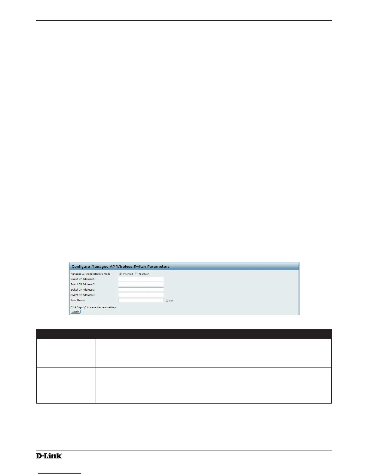 To add the IP address of a D-Link Uniîšżed Wireless Switch to the AP, click the Managed Access Point tab under the