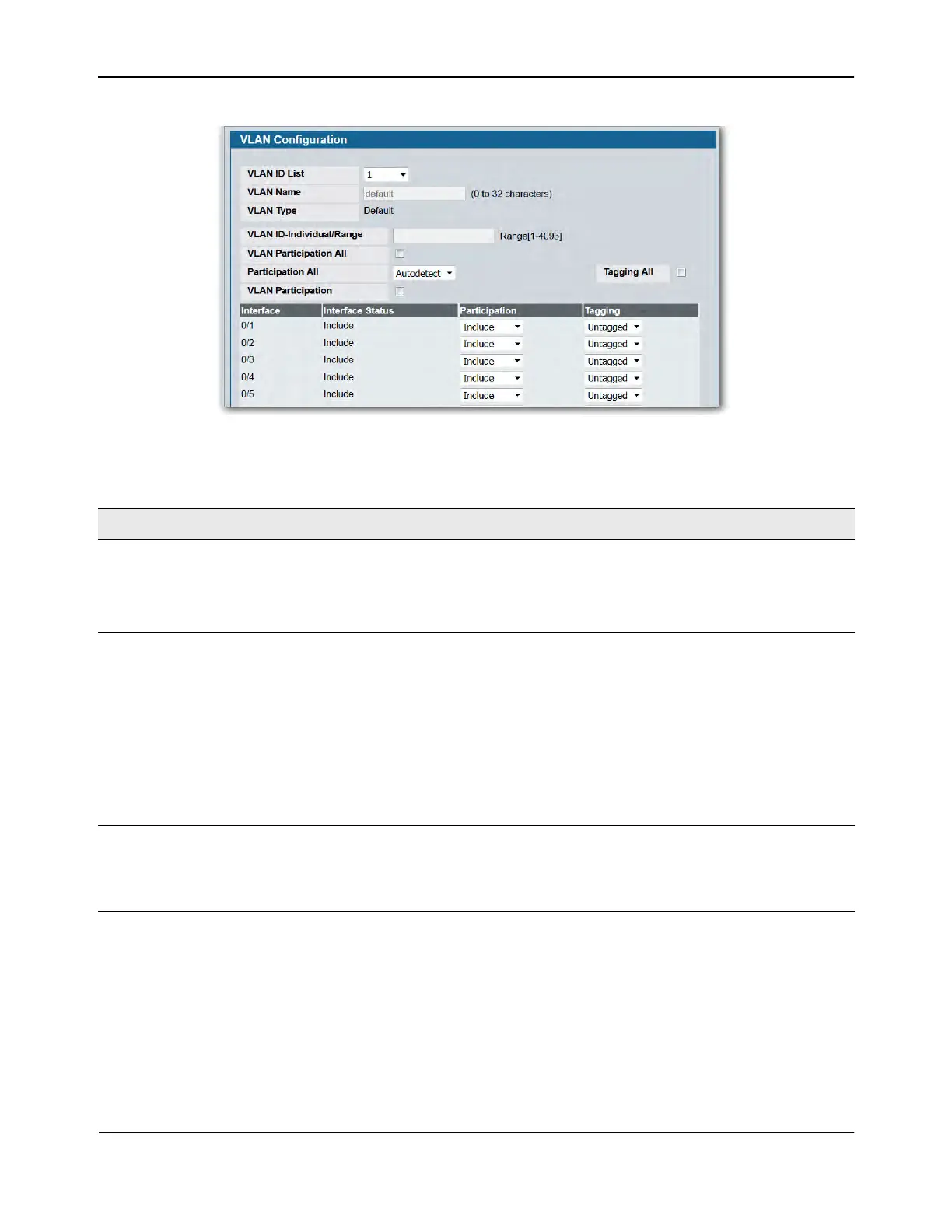 Participation All Use this field to specify whether all the ports will participate in this VLAN. The