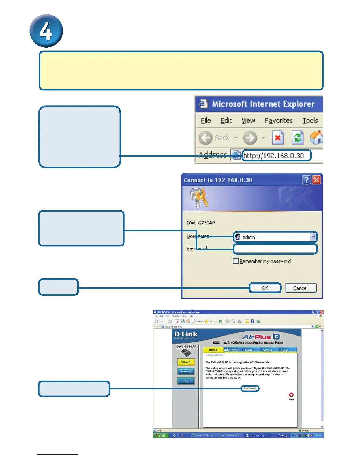 the DWL-G730AP using a standard Ethernet cable. You will need to assign the network