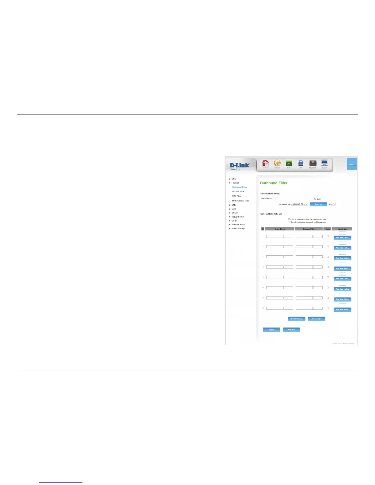 Outbound Filter enables you to control what packets are allowed to be sent out to the Internet. The outbound lter applies to all outbound packets.