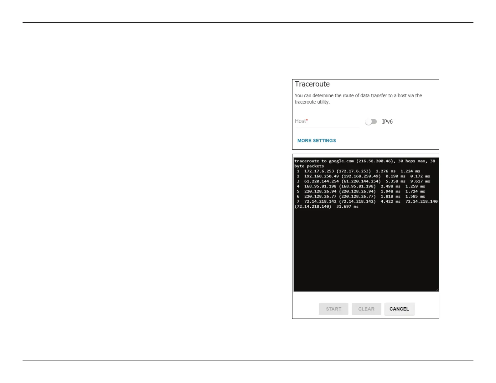 Click START to begin the traceroute test or CLEAR to