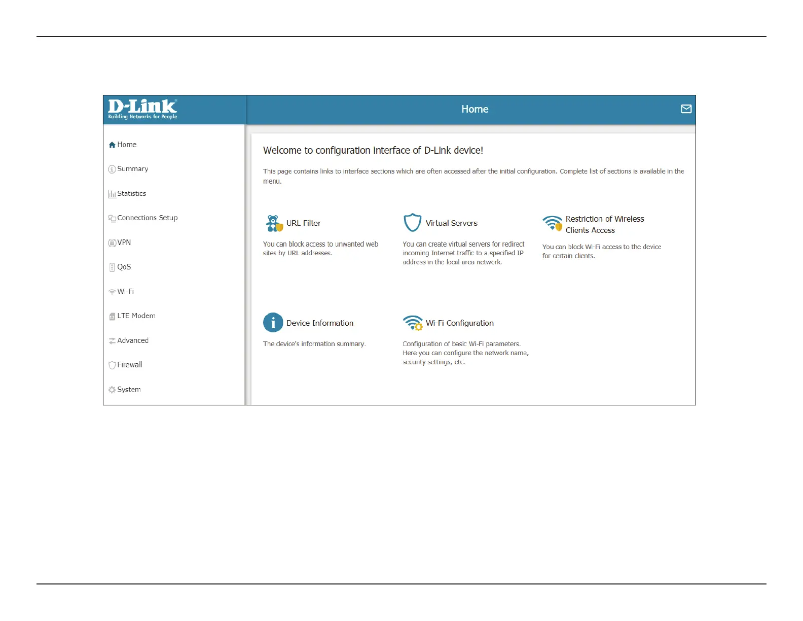 Once you have successfully logged in, you will see the Home page. You can use this page to navigate to the dierent conguration sections of