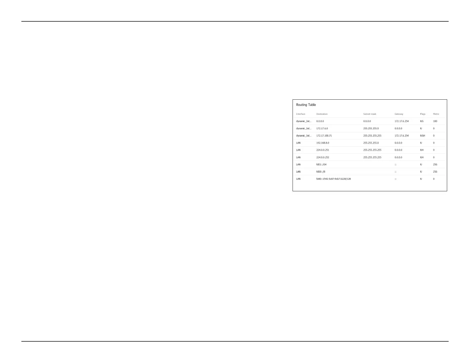 This page displays routing information. The table contains destination IP addresses, gateways, subnet masks, and other data.
