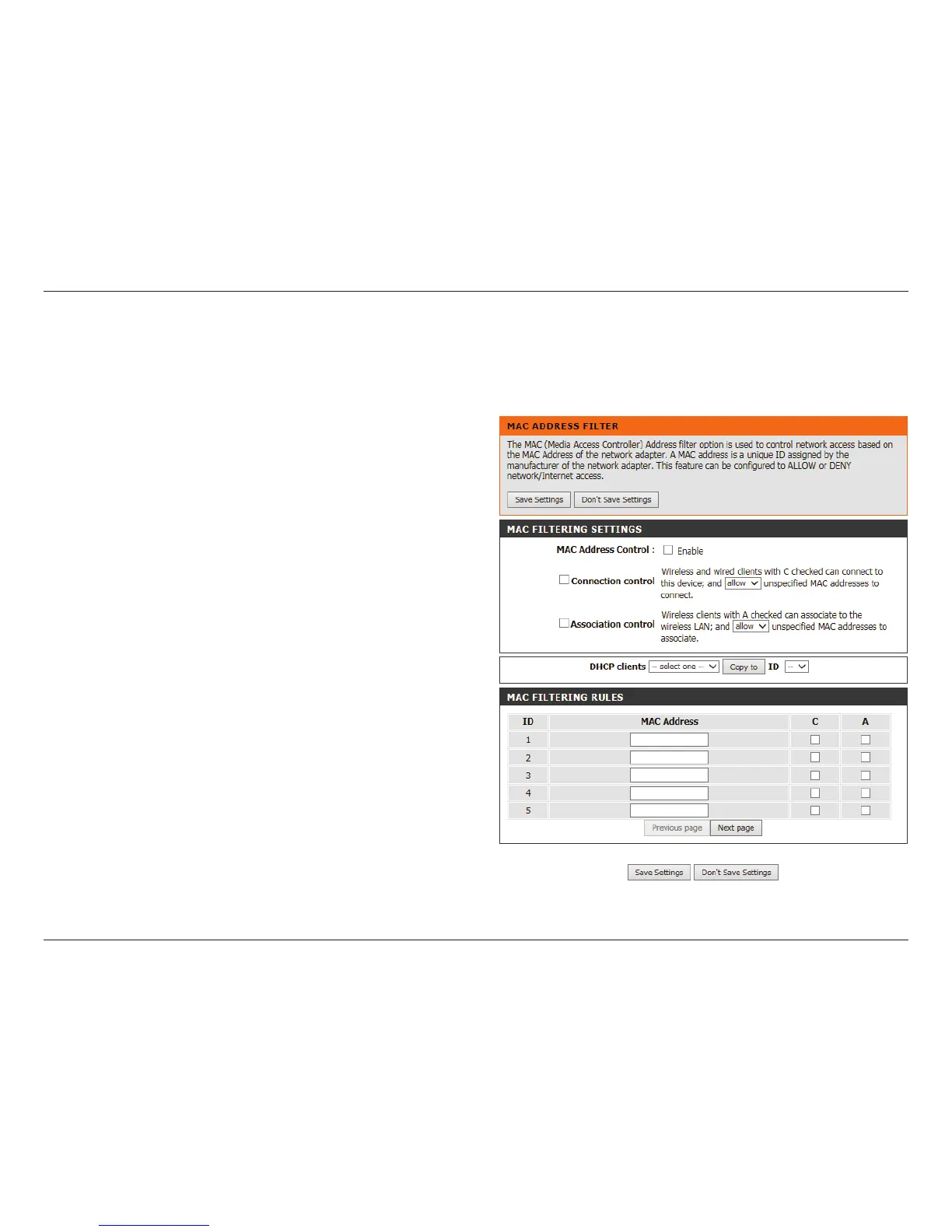 A MAC address is a unique ID assigned by the manufacturer of the network adapter. This feature can be congured to ALLOW or DENY network/
