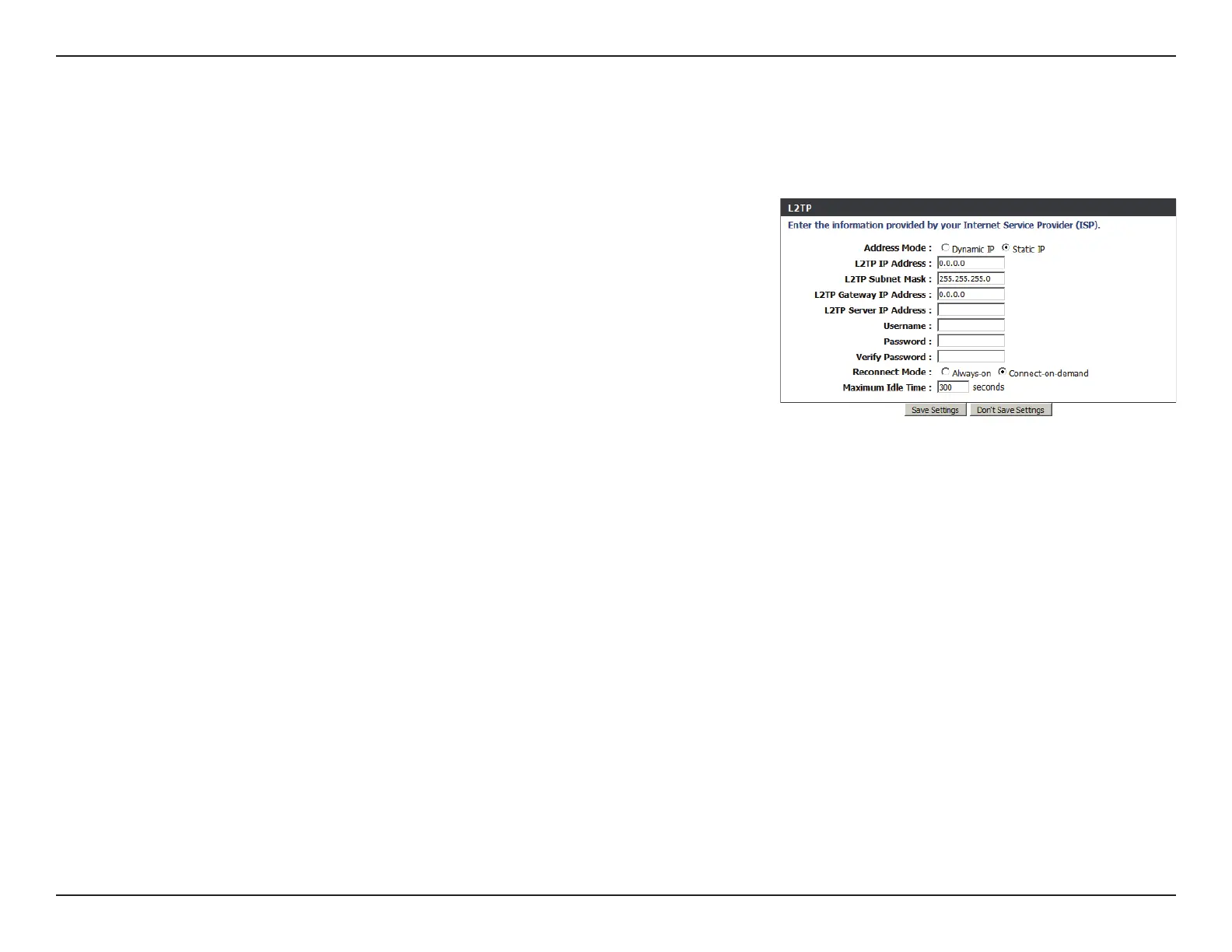 Choose this Internet connection if your ISP provides you L2TP account. After modifying any settings, click Save Settings to save your changes.