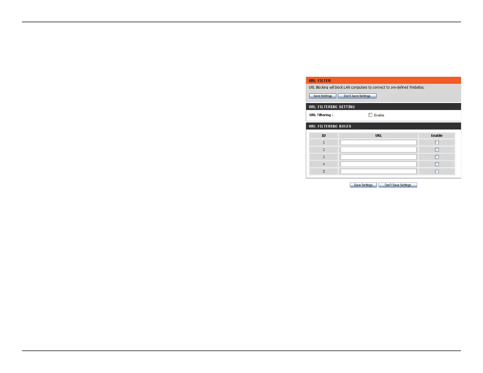 URL Filter allows you to set up a list of websites that will be blocked from users on your network. After modifying any settings, click Save Settings
