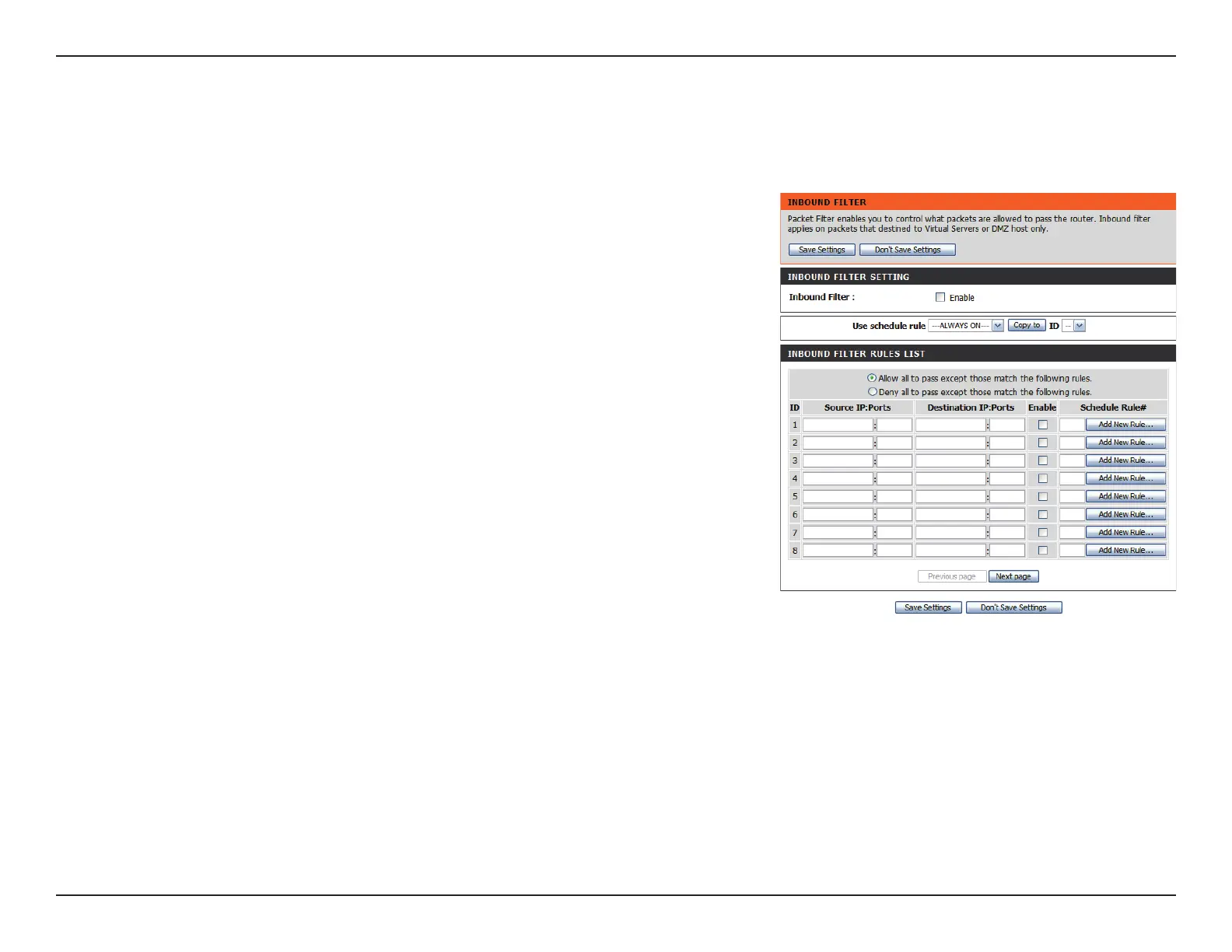 Inbound Filter enables you to control what packets are allowed to come in to your network from the Internet. The inbound lter only applies to