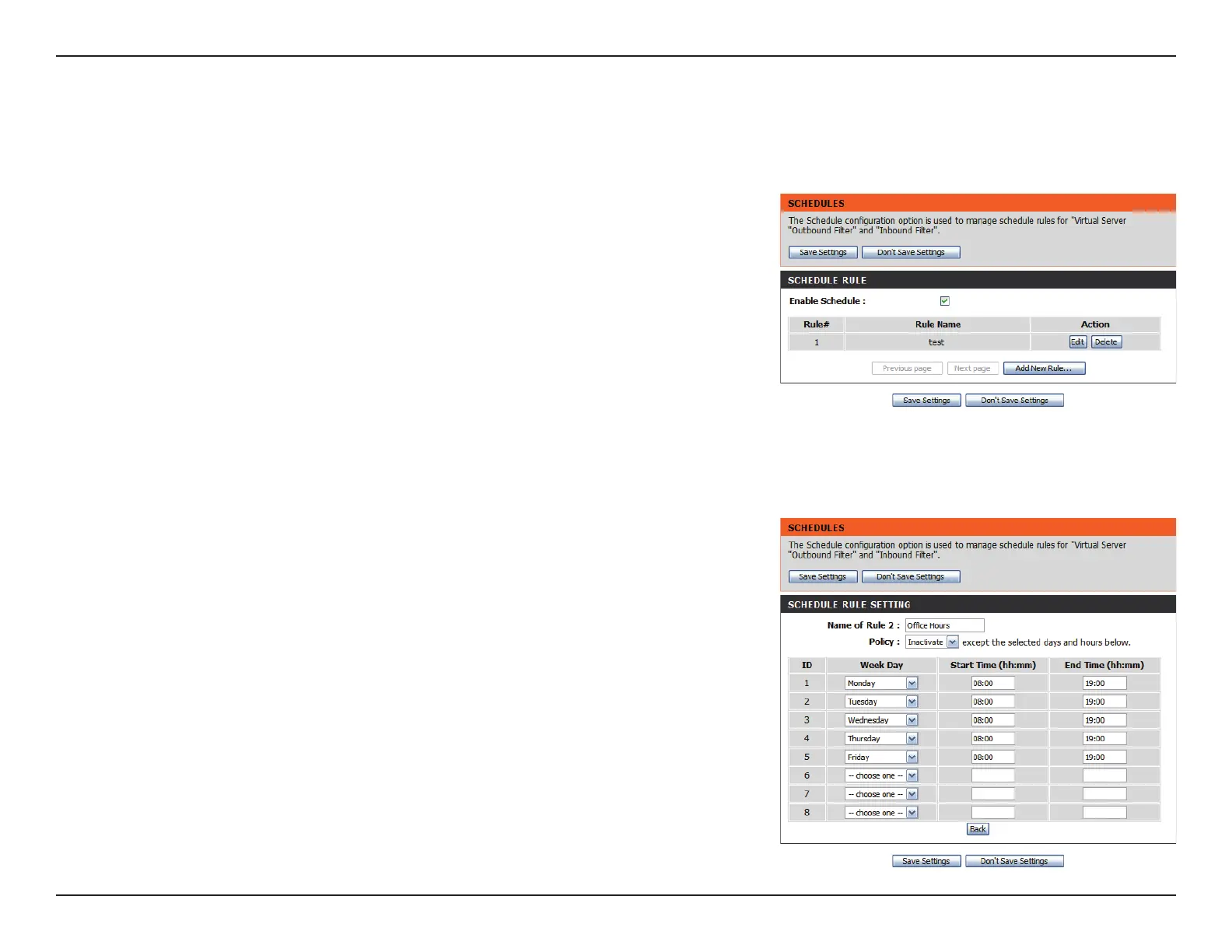 This section allows you to manage schedule rules for various rewall and parental control features. After modifying any settings, click Save Settings