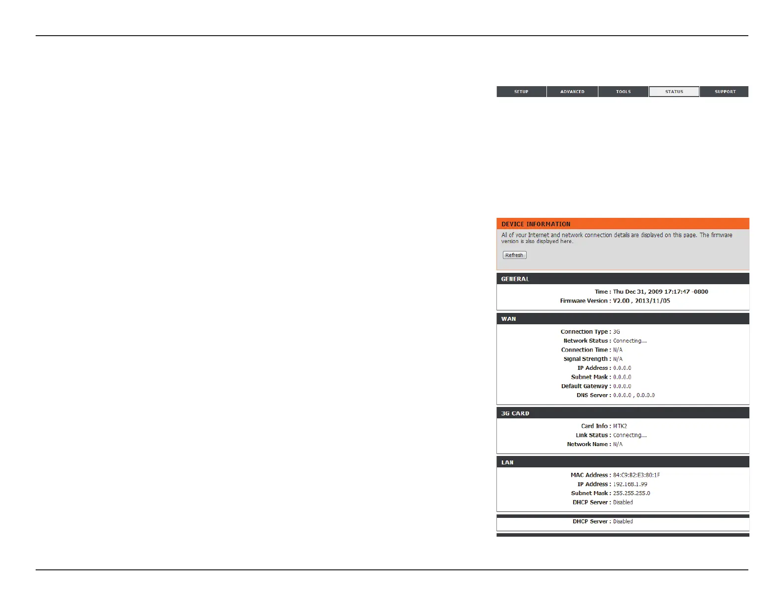 including WAN, 3G, network, and wireless. To view the Status pages, click on STATUS at the