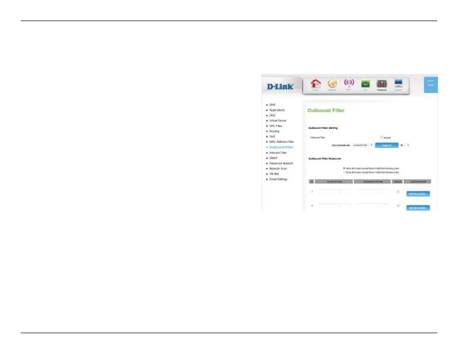 Outbound Filter enables you to control what packets are allowed to be sent out to the Internet. The outbound lter applies to all outbound packets.
