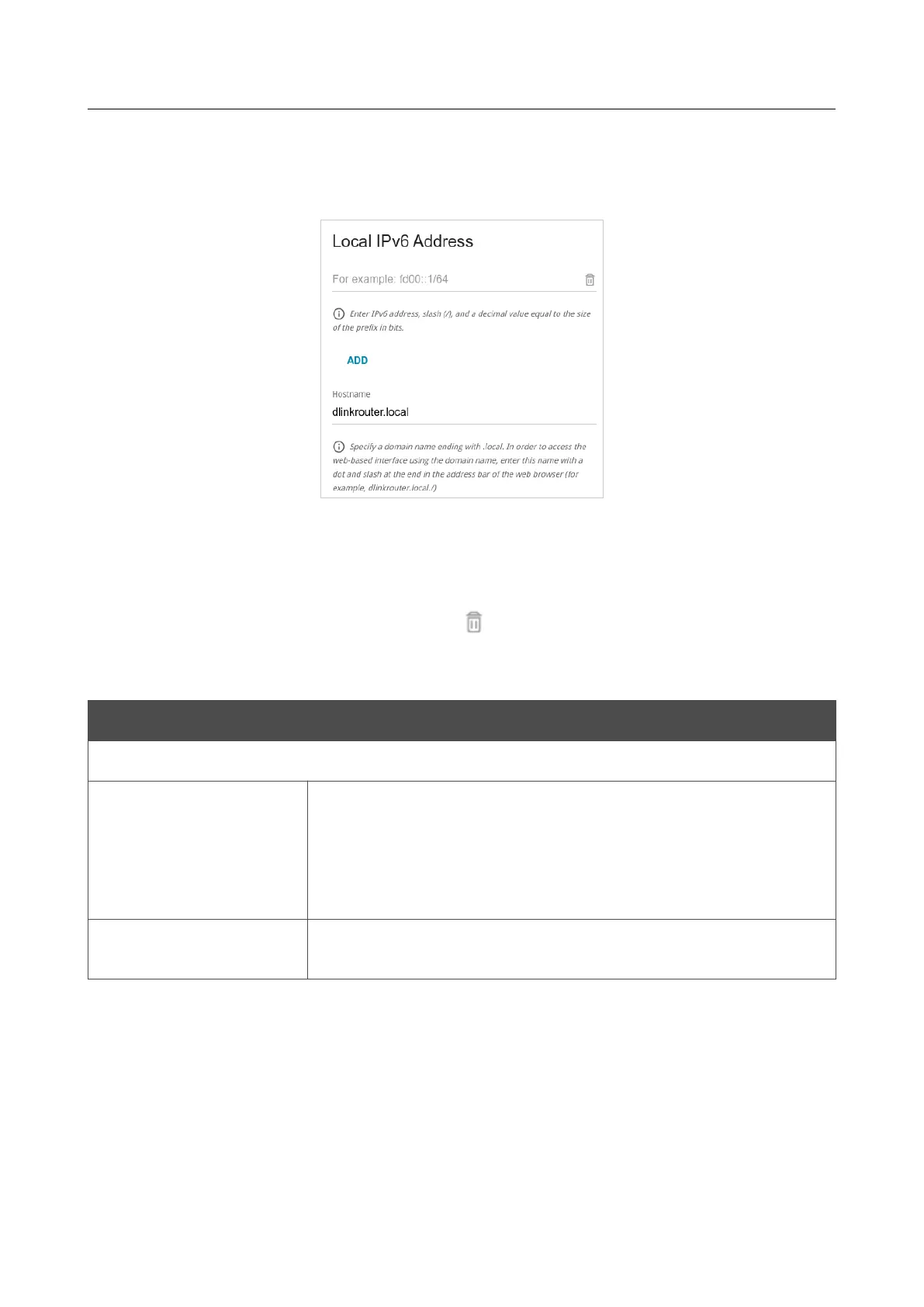 To remove an IPv6 address, click the DELETE ( ) button in the corresponding line of the table.