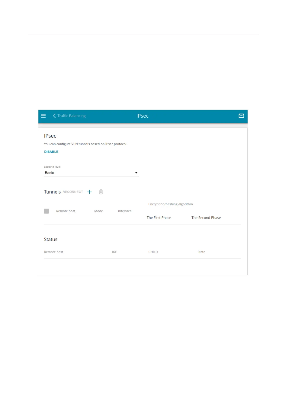 To allow IPsec tunnels, click the ENABLE button. Upon that the Tunnels and Status sections