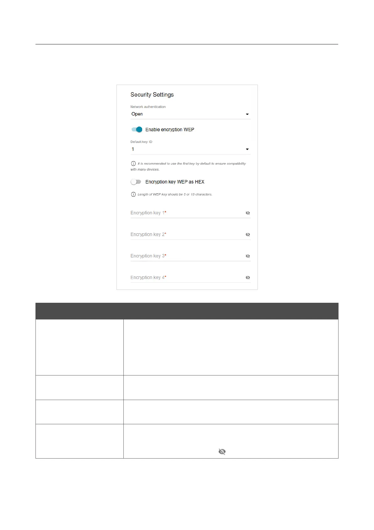 When the Open or WEP value is selected, the following settings are displayed on the page