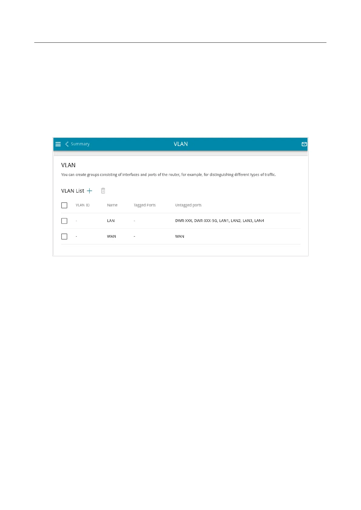 • WAN: For the WAN interface; it includes the WAN port. You can edit or delete this VLAN.