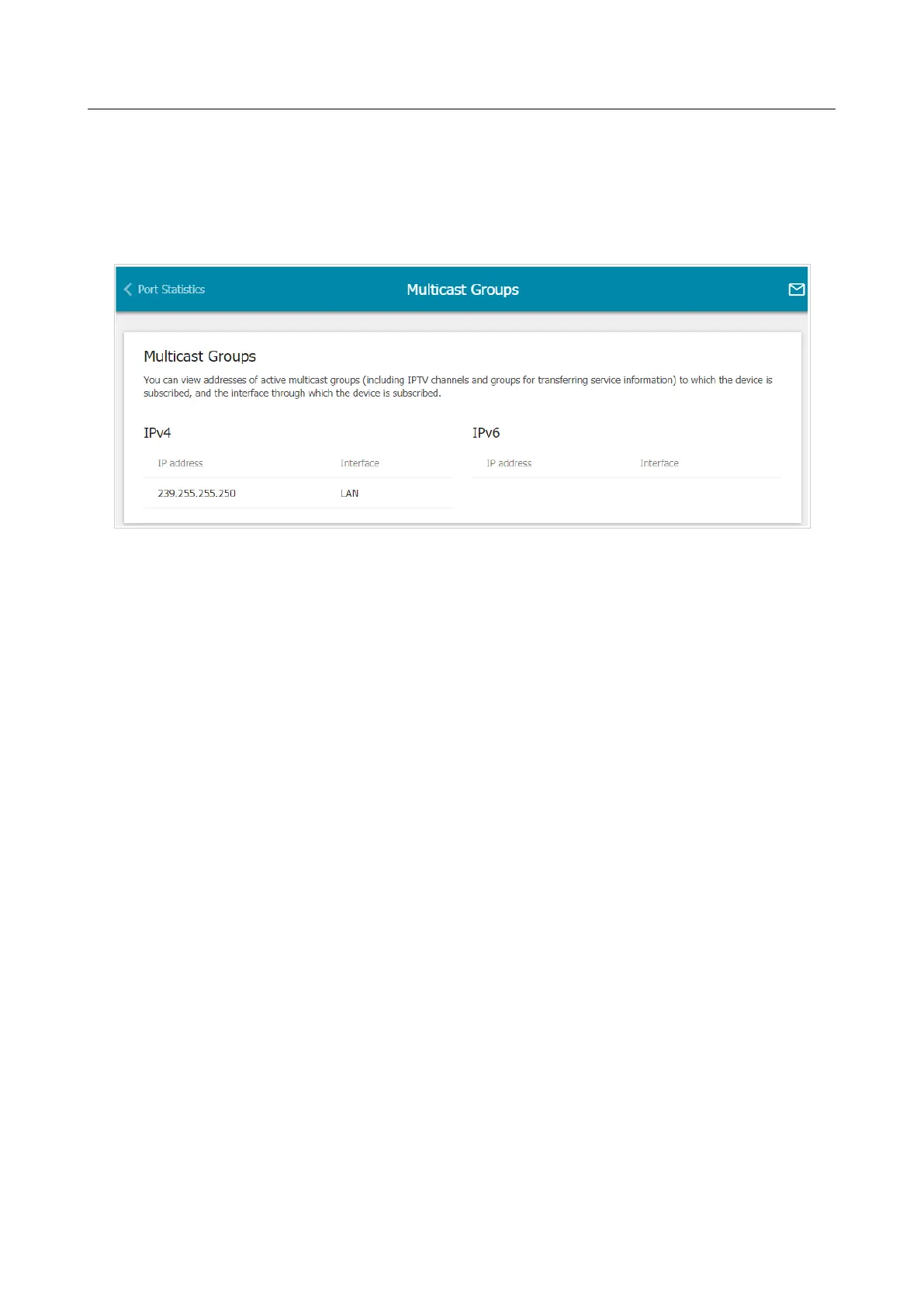 The Statistics / Multicast Groups page displays addresses of active multicast groups (including