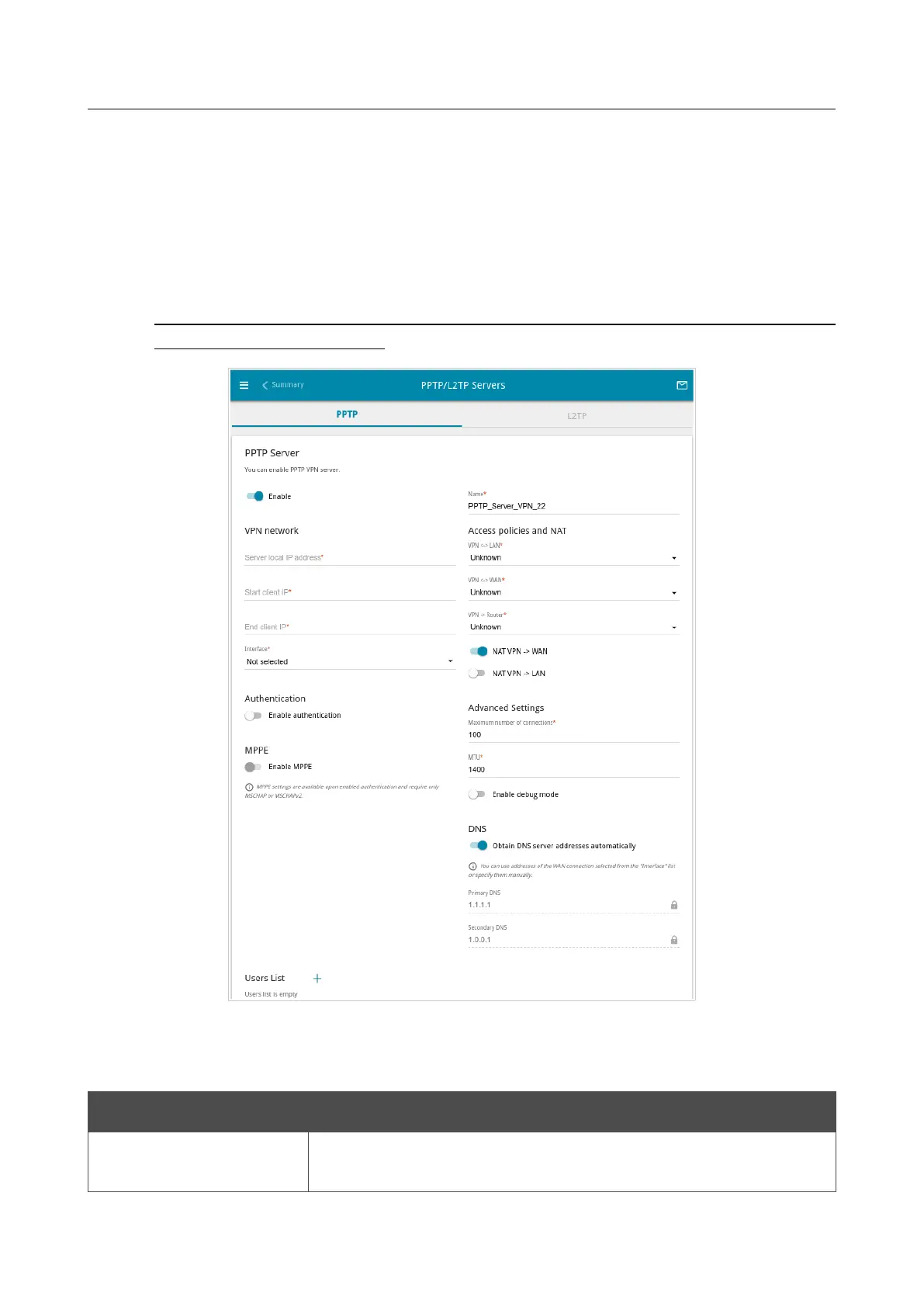 Before creating the PPTP or L2TP server, it is required to create user accounts (see the