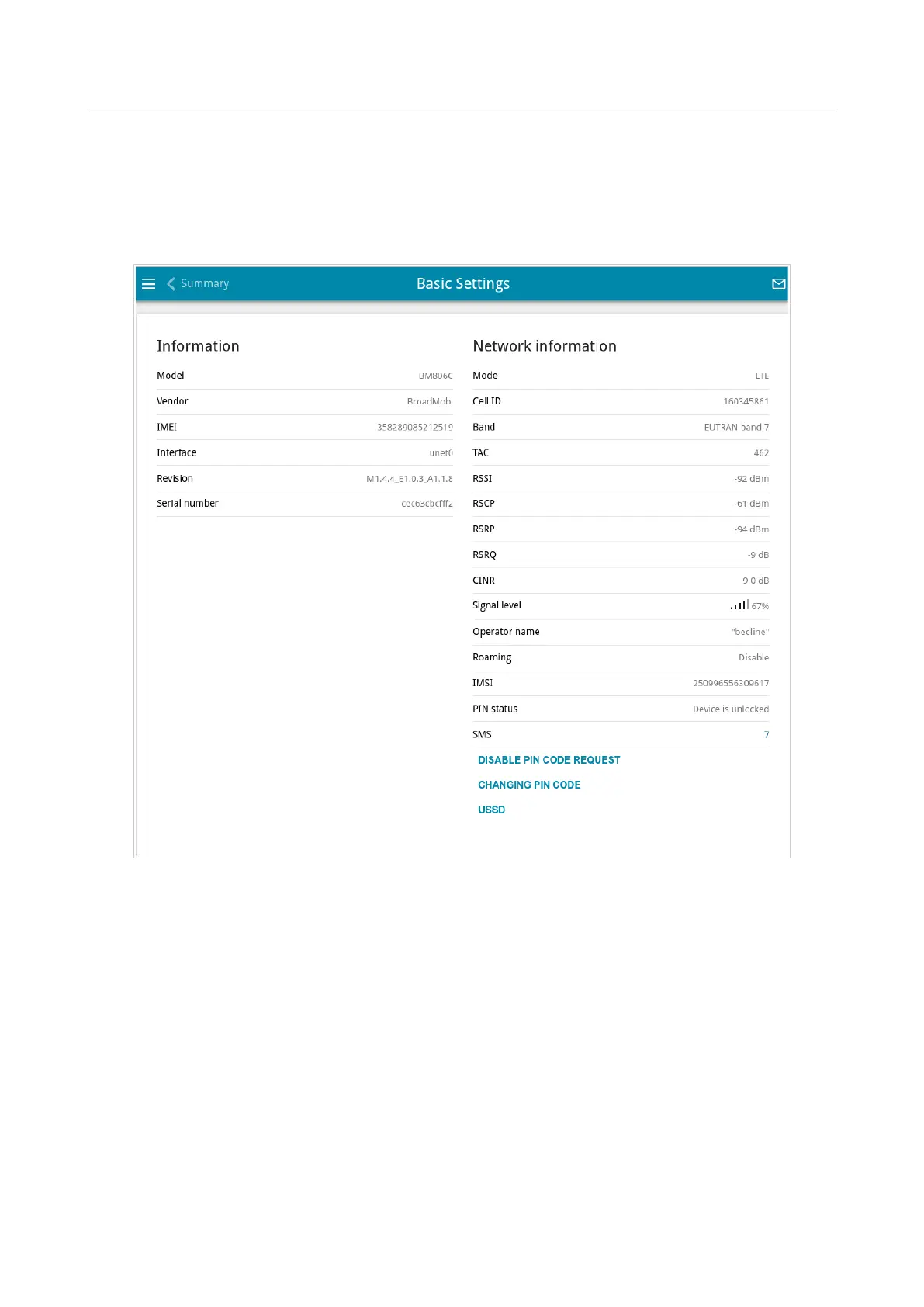 On the LTE Modem / Modem 1 / Basic Settings page, you can view data on the built-in LTE