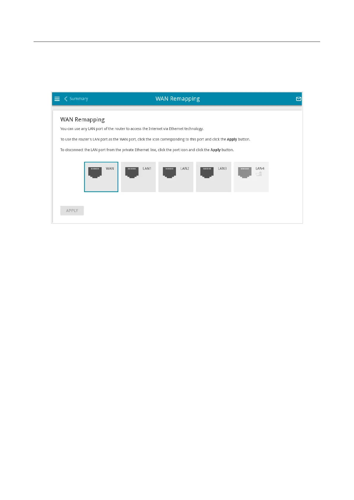 corresponding to this port and click the APPLY button. The WAN port will be highlighted in teal