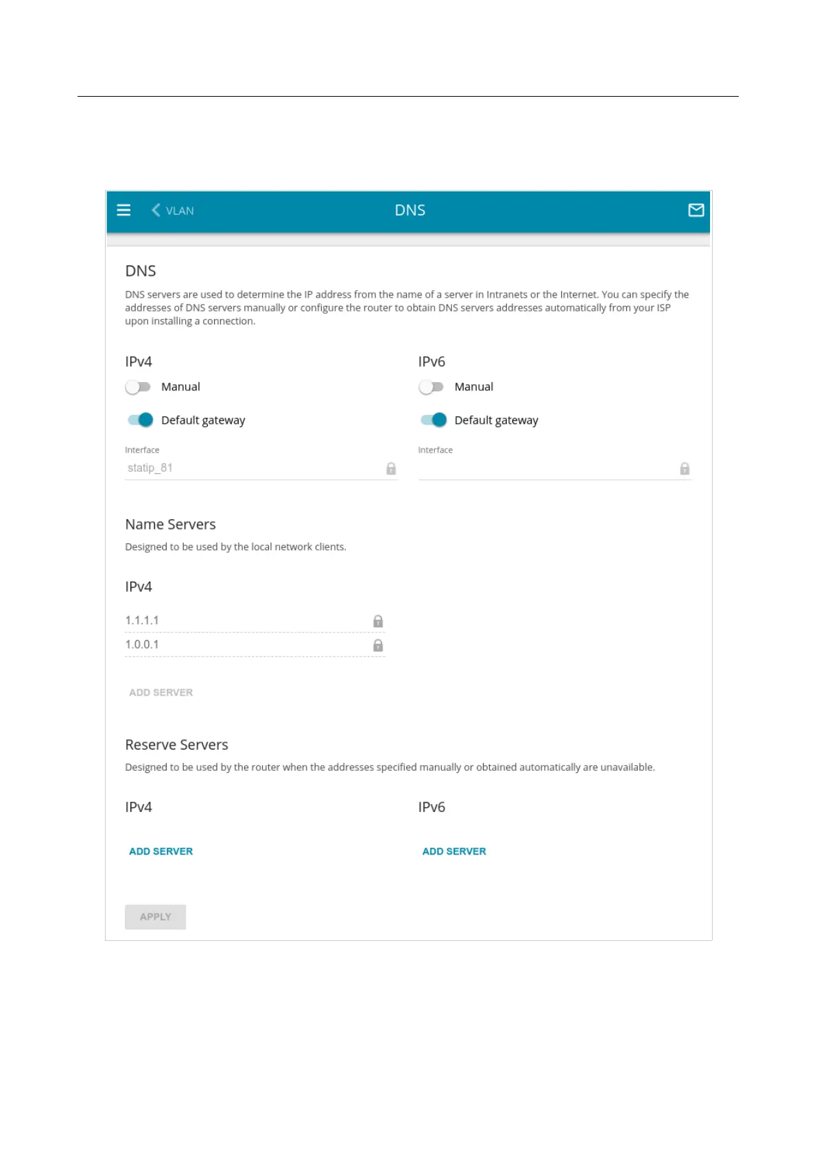 On the Advanced / DNS page, you can add DNS servers to the system.