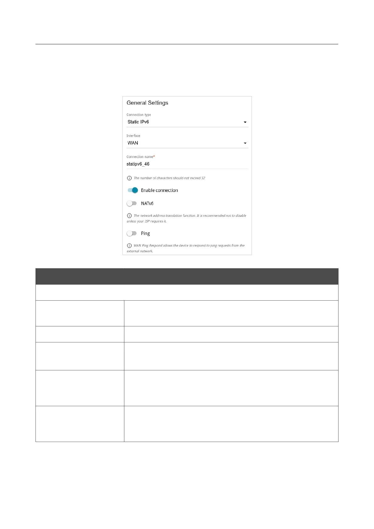 Figure 70. The page for creating a new Static IPv6 connection. The General Settings section.
