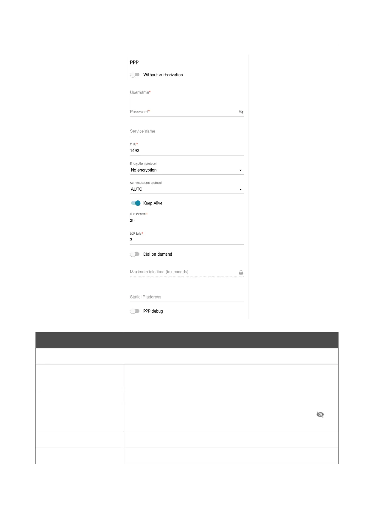Figure 75. The page for creating a new PPPoE connection. The PPP section.