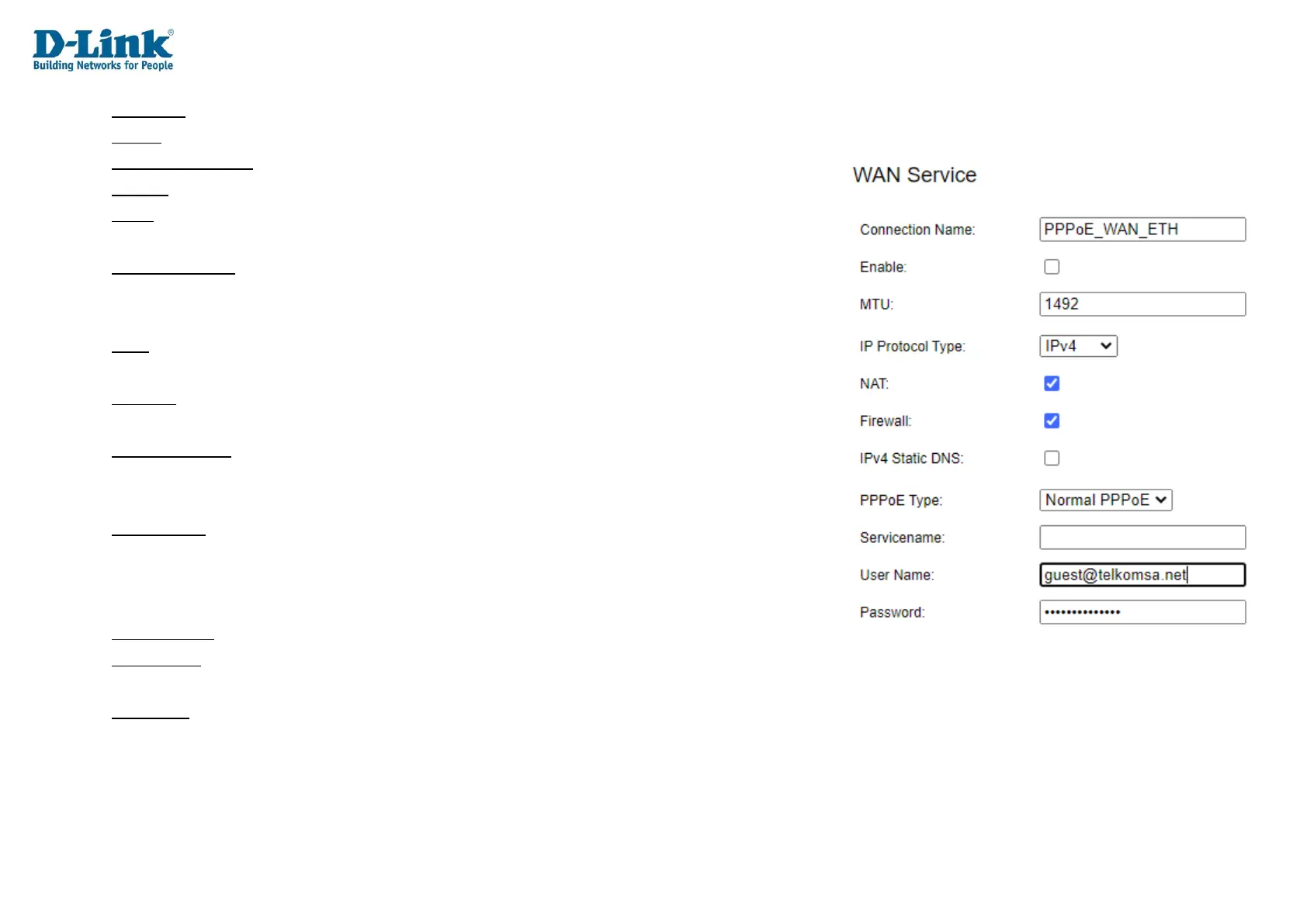 Servicename: The name of the PPPoE service on the router. This is used for reference only.