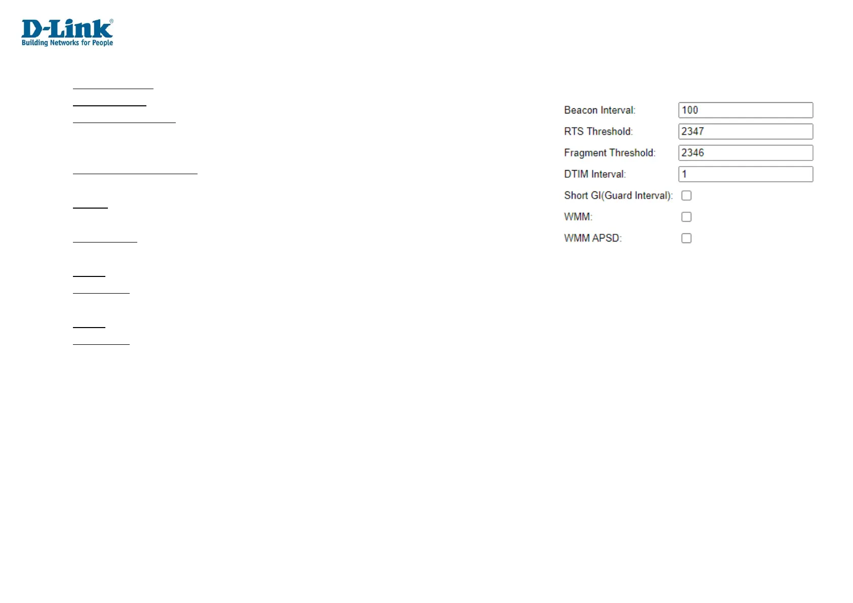 Beacon Interval: The interval between SSID beacon broadcasts. The default is 100.