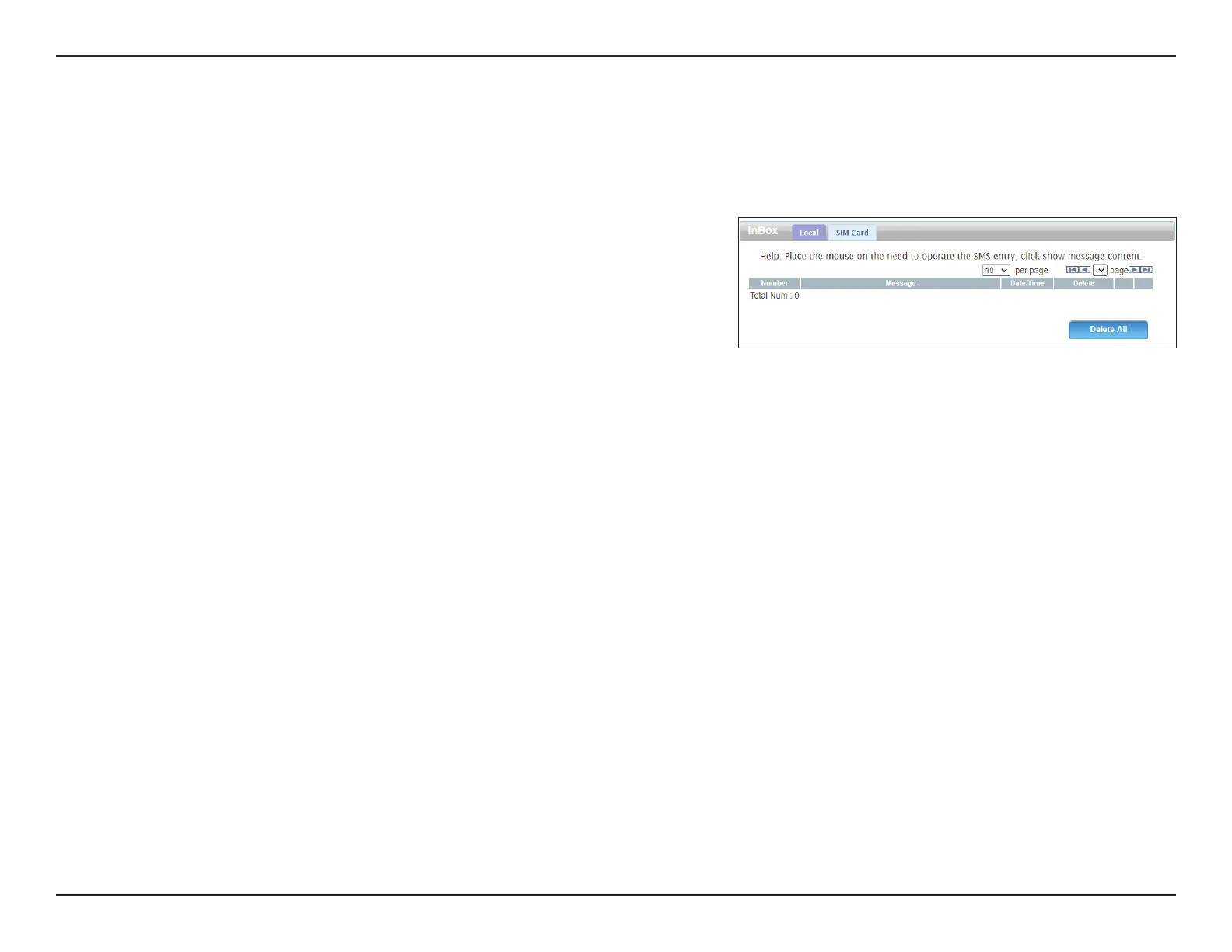 This page allows you to view messages in your inbox. Messages can either be saved in the router’s internal memory (click the Local tab) or on the