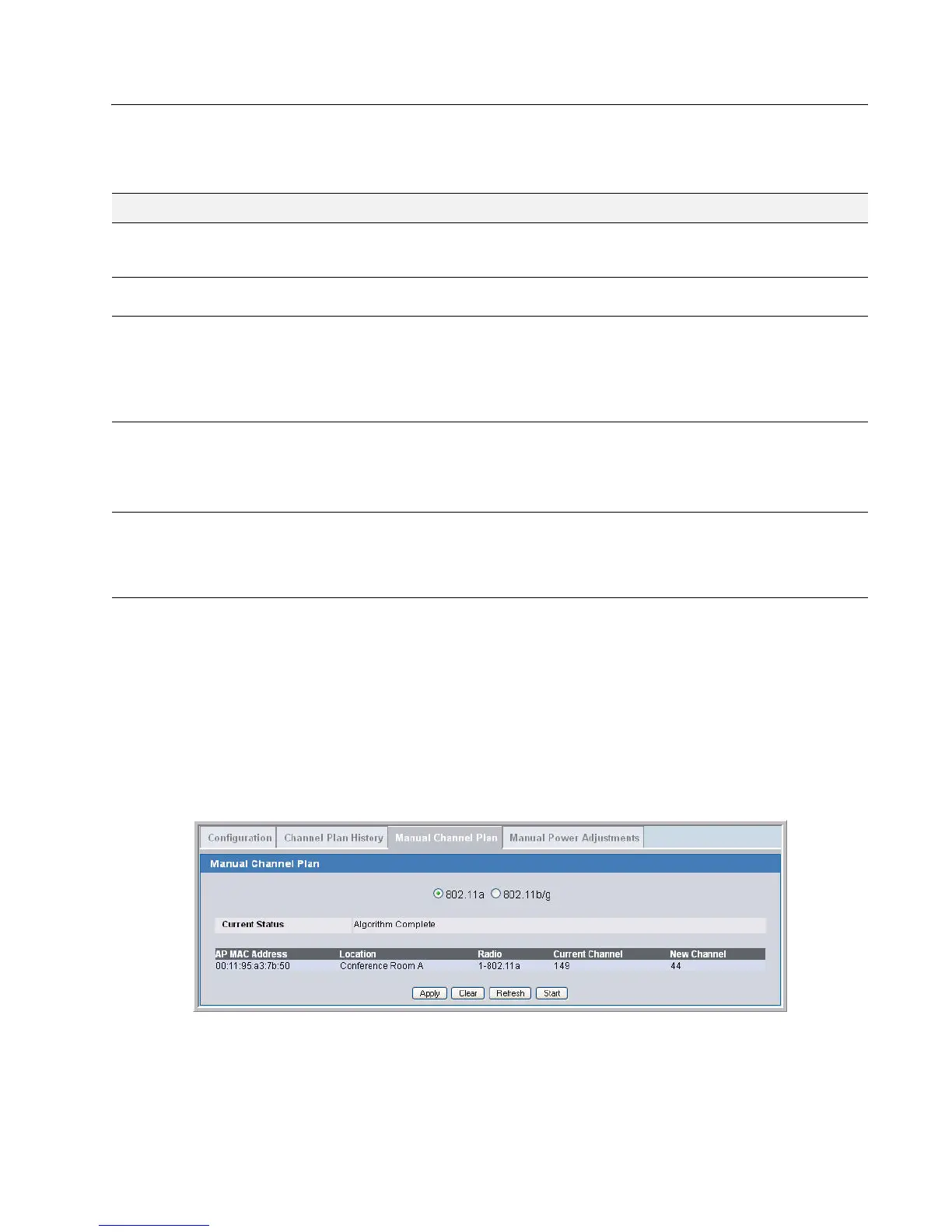 To manually run the channel plan adjustment feature, select the radio to update the channels on (802.11a or 802.11g) and