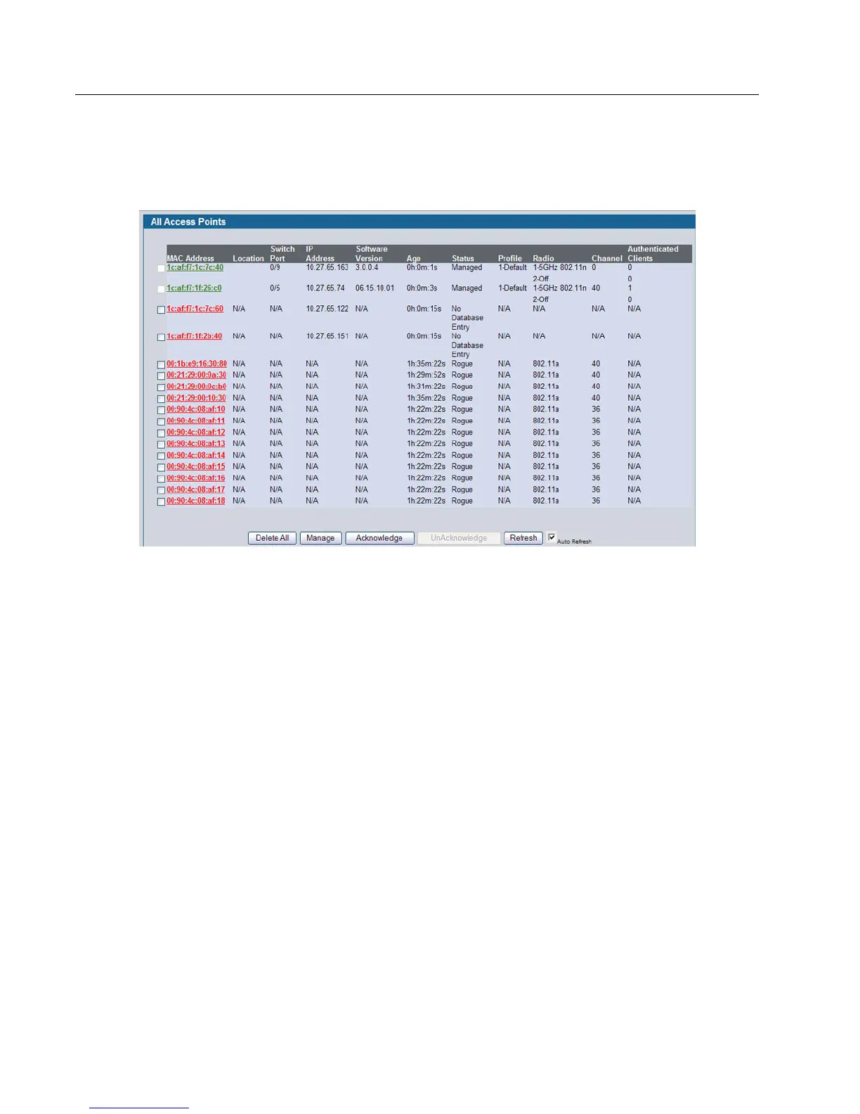 To identify an AP as an Acknowledged Rogue, select the check box next to the MAC address of the AP and click