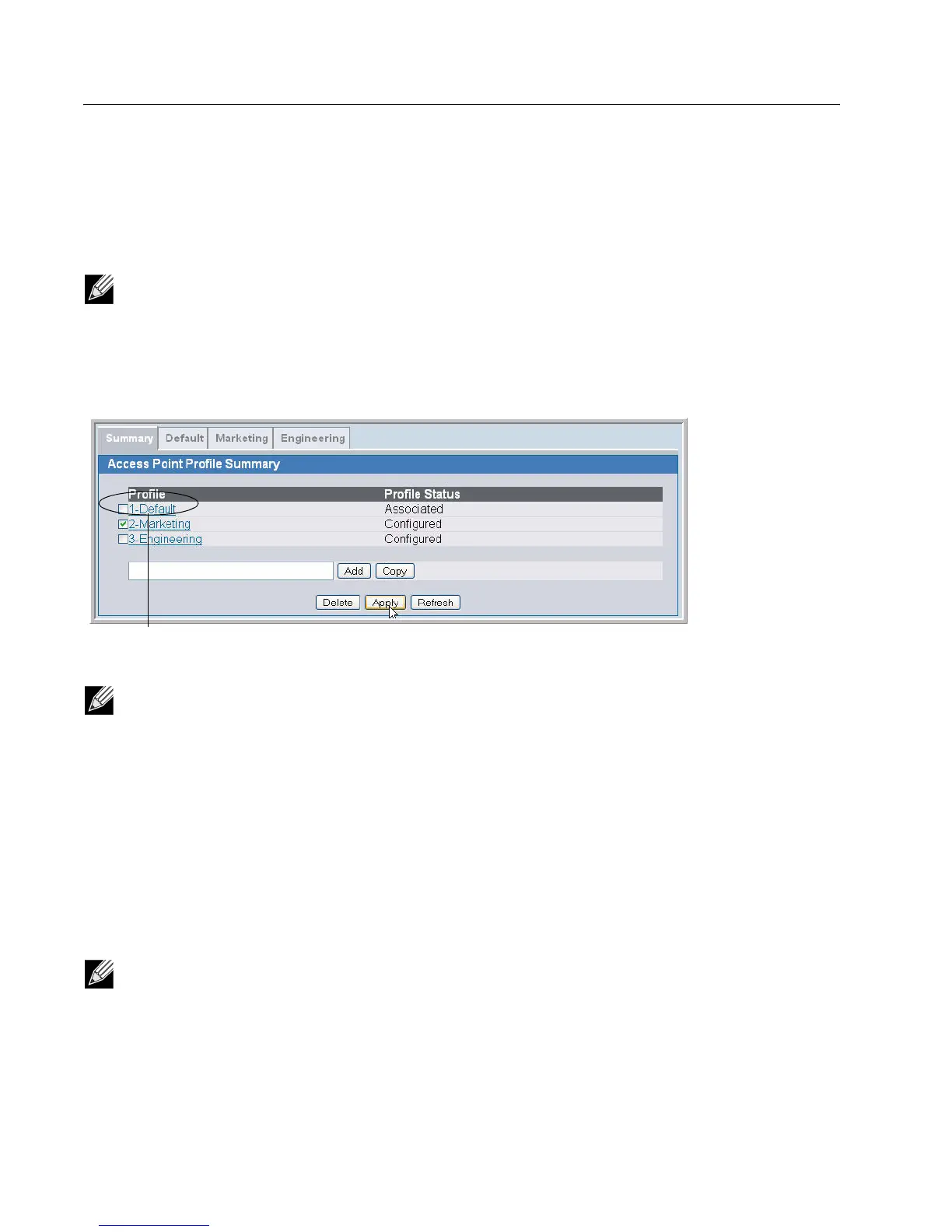 To apply the profile changes to all access points that use a profile, select the profile and click Apply, as Figure 73 shows.