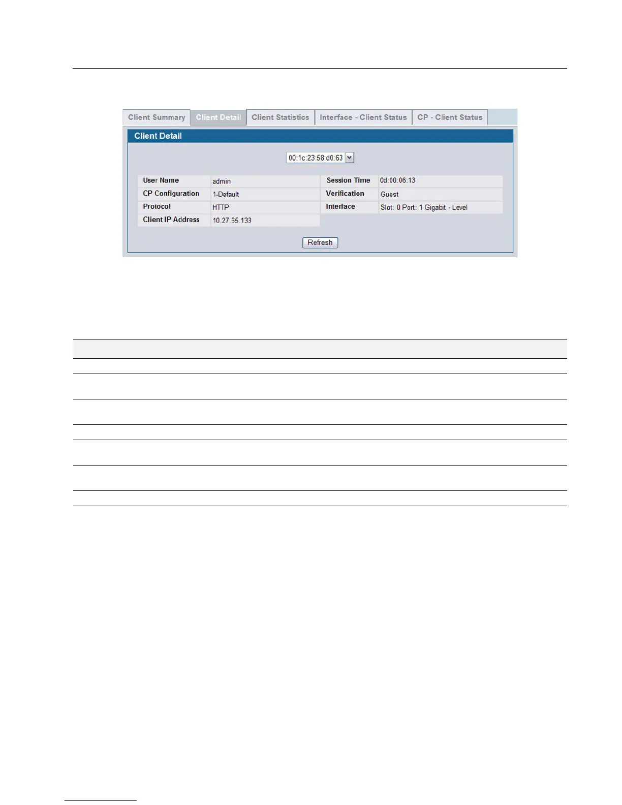 The menu lists each associated client by MAC address. To view status information for a client, select it from the list. Table 78