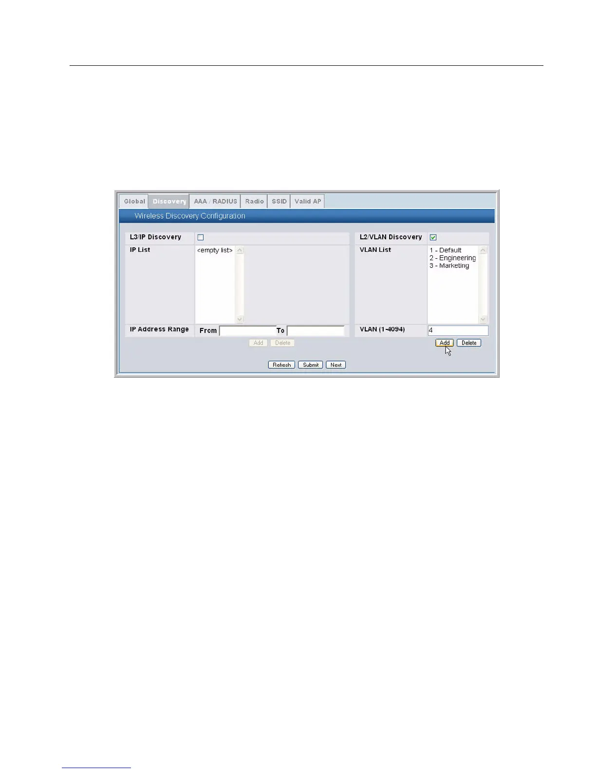 3 Make sure the box for L2/VLAN Discovery is selected and add the management VLAN ID of an AP or peer switch to