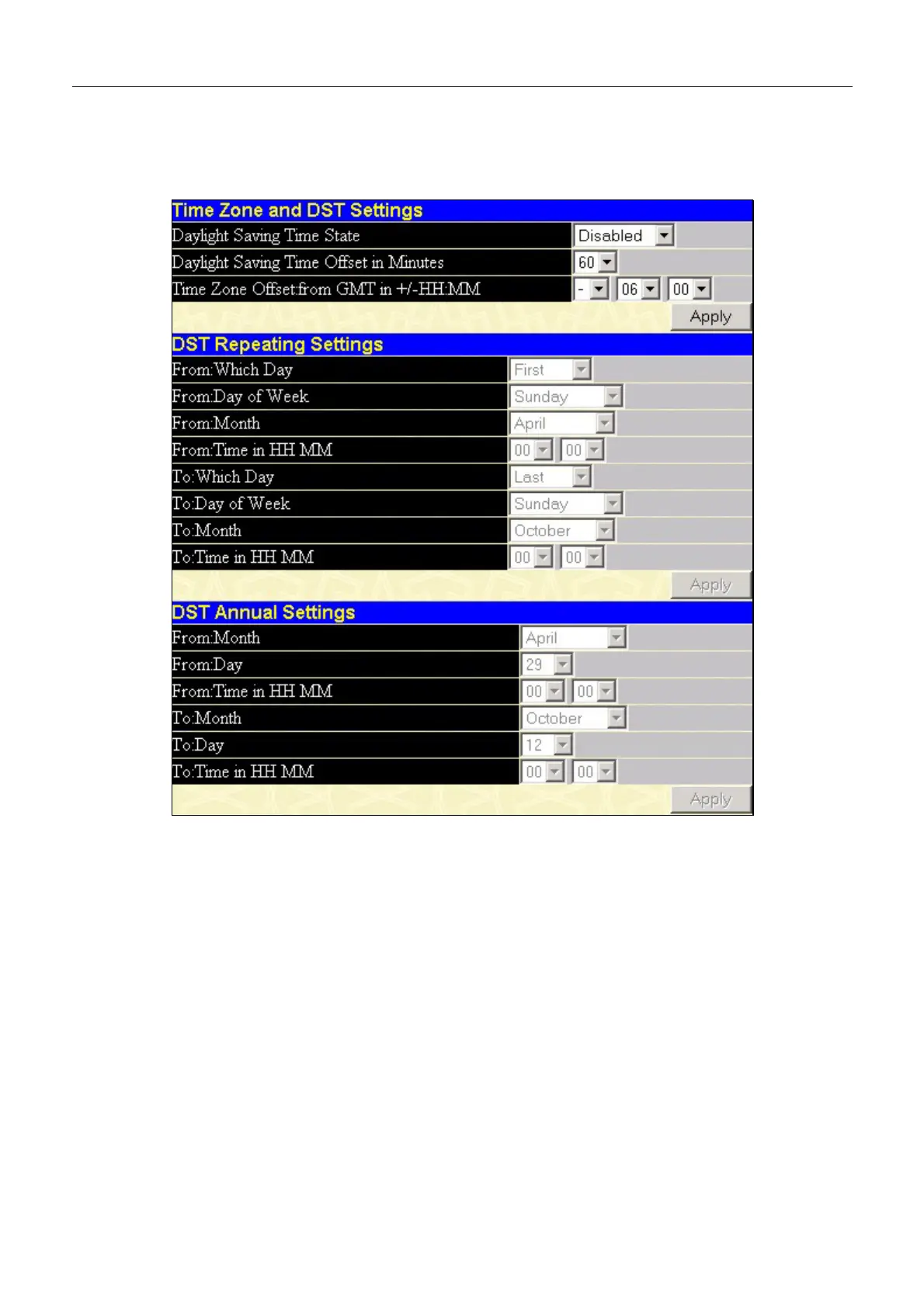 The following are screens used to configure time zones and Daylight Savings time settings for SNTP. Open the