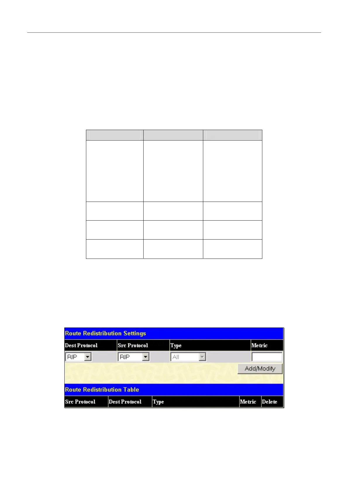 current routing protocol. The Switch can redistribute routing information between the OSPF and RIP routing protocols to