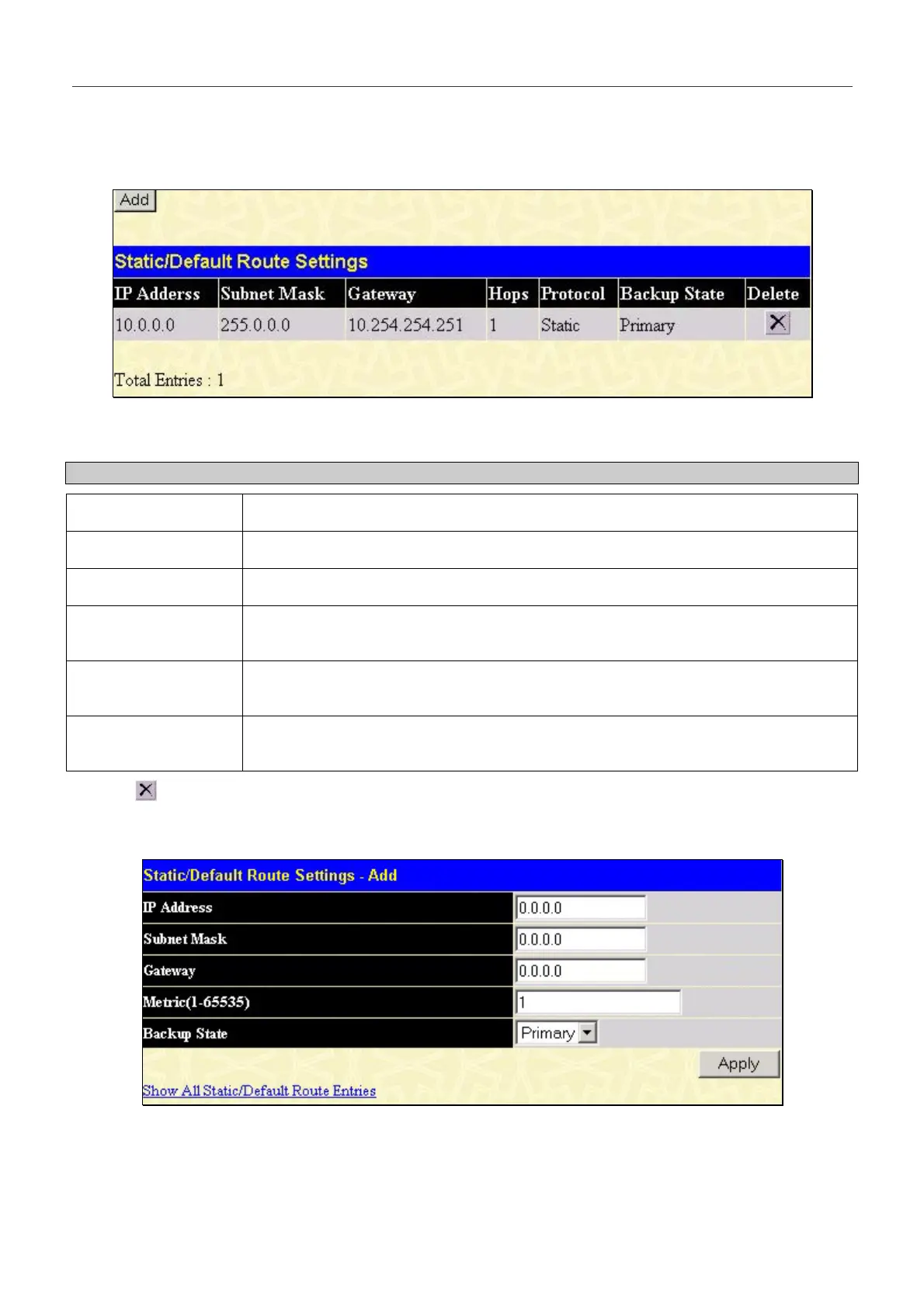 Click the if you would like to delete this entry from the Static/Default Route Settings table.