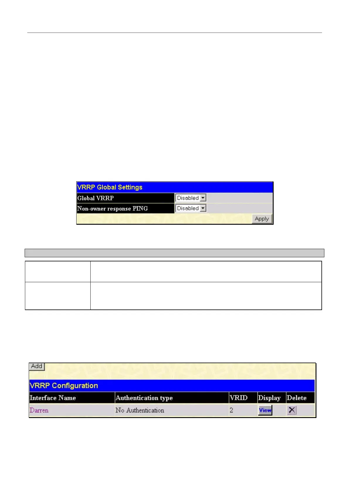 Global VRRP Use the pull-down menu to enable or disable VRRP globally on the Switch. The