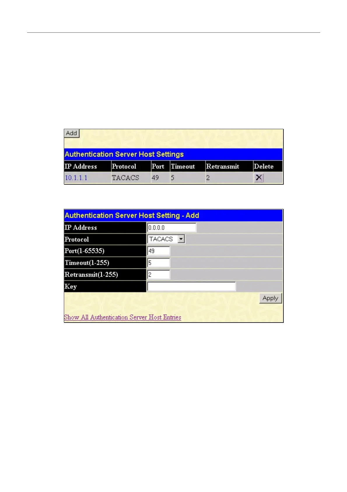 This window will set user-defined Authentication Server Hosts for the TACACS / XTACACS / TACACS+ / RADIUS