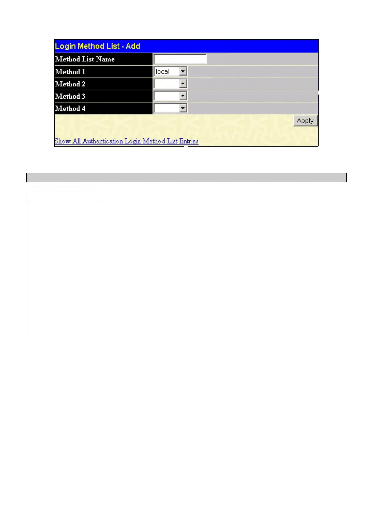 Switch, which is defined by the Administrator. A maximum of eight (8) Enable Method Lists can be implemented on the