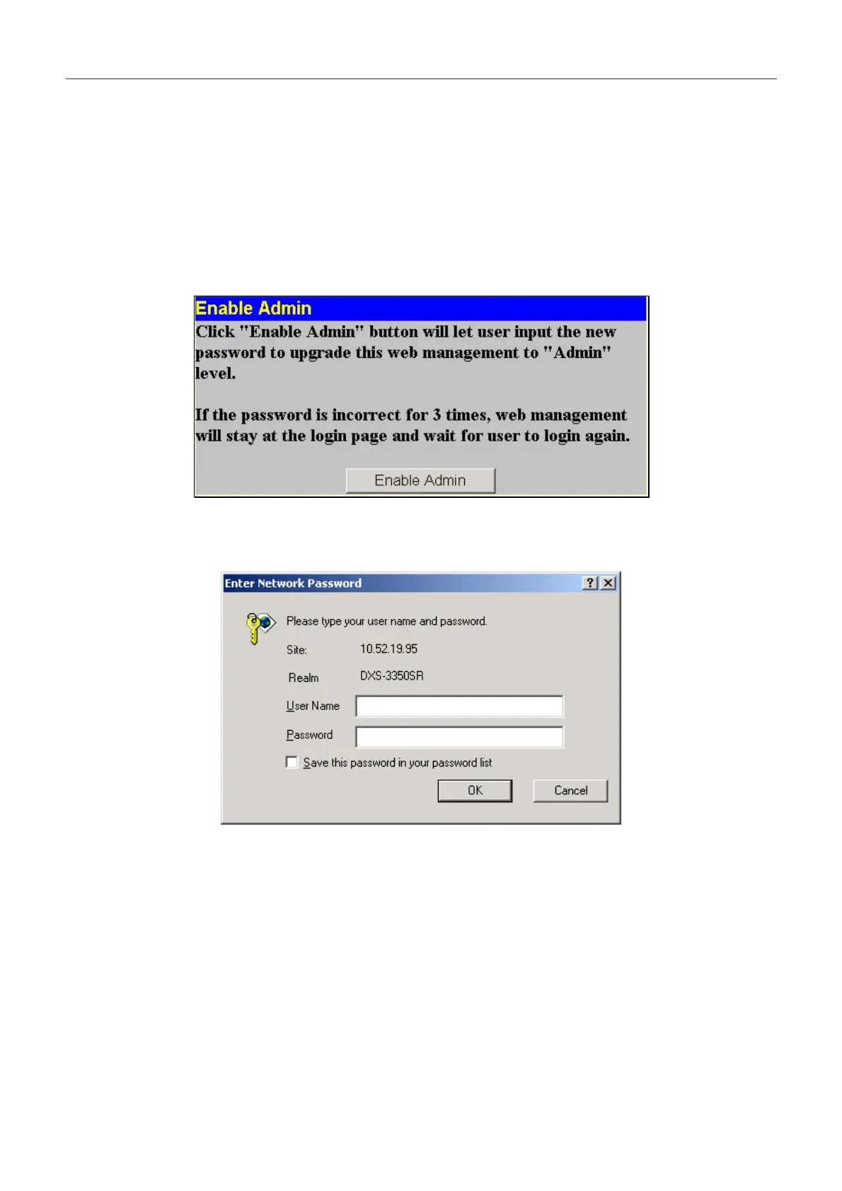 The Enable Admin window is for users who have logged on to the Switch on the normal user level, and wish to be