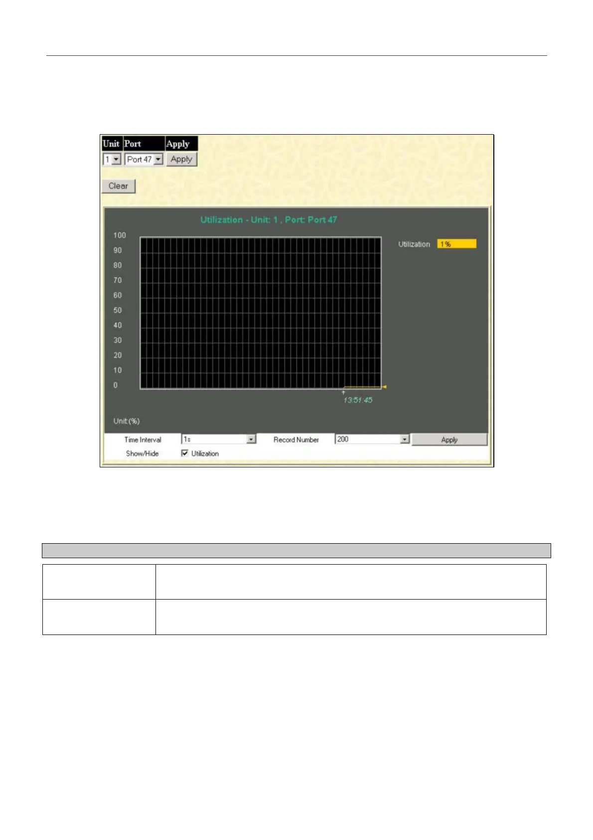 Select the Unit and Port number and click the Apply button above the display to view the specified port utilization graph.