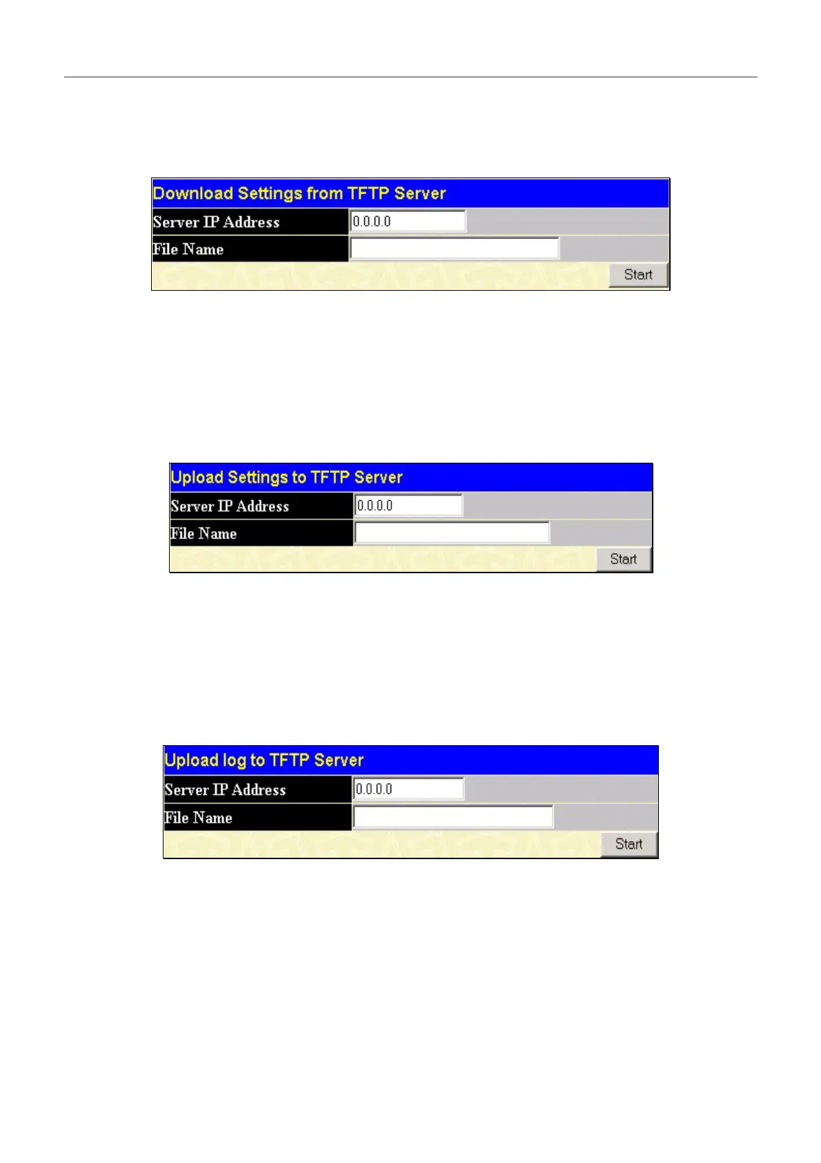Click Start to record the IP address of the TFTP server and to initiate the file transfer.